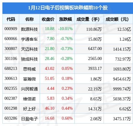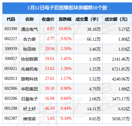 1月12日电子后视镜板块较上一交易日上涨0.96%,通达电气领涨。当日上证指数报收于3163.45,上涨0.05%。深证成指报收于11465.73,上涨0.23%。电子后视镜板块个股涨跌见下表: