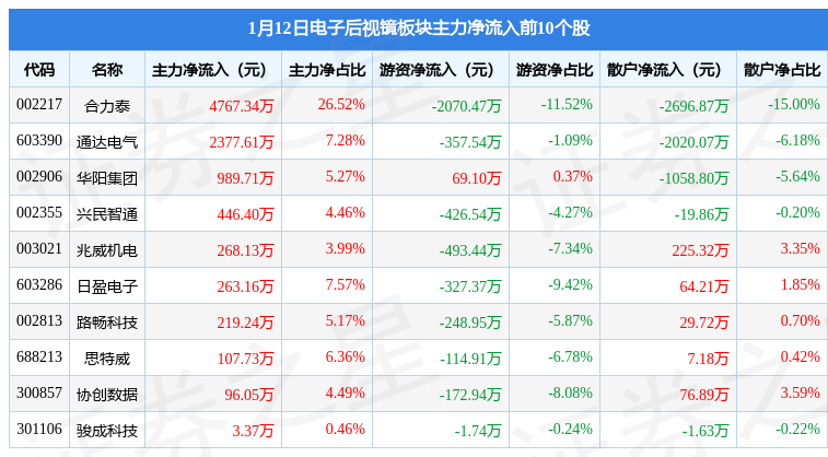 从资金流向上来看,当日电子后视镜板块主力资金净流出1.52亿元,游资资金净流出187.98万元,散户资金净流入1.54亿元。电子后视镜板块个股资金流向见下表: