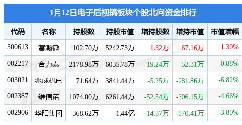 北向资金方面,当日电子后视镜板块北向资金持股市值为3.58亿元,减持0.11亿元。其中增持最多的是富瀚微(300613),增持了67.16万元。减持持最多的是华阳集团(002906),减持了570.41万元。电子后视镜板块北向资金持股变动明细见下表: