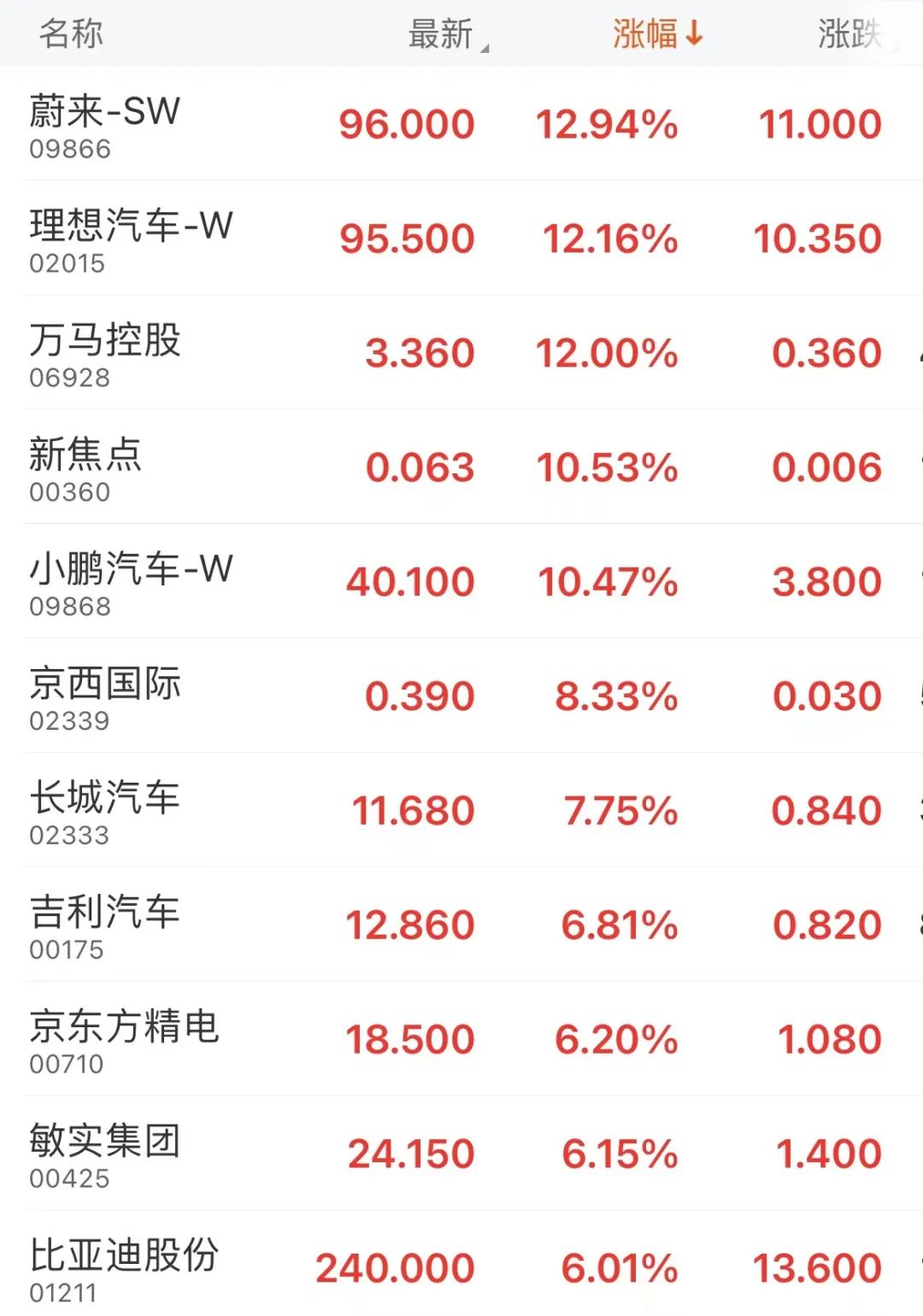 港股汽车板块集体走强,截至收盘,蔚来-SW涨12.94%、理想汽车-W涨12.16%、小鹏汽车-W涨10.47%、长城汽车涨7.75%、比亚迪股份涨6.01%。