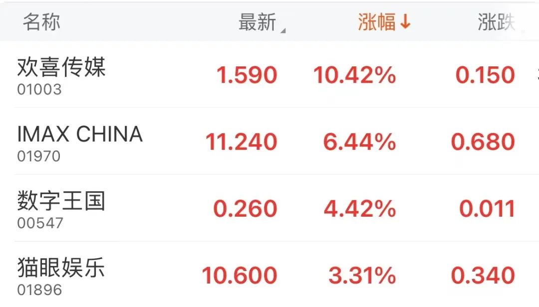 1月26日,港股影视股集体走强,早盘时欢喜传媒一度涨近30%,IMAX中国一度涨超10%。截至收盘,欢喜传媒涨10.42%、IMAX中国涨6.44%、数字王国涨4.42%、猫眼娱乐涨3.31%。