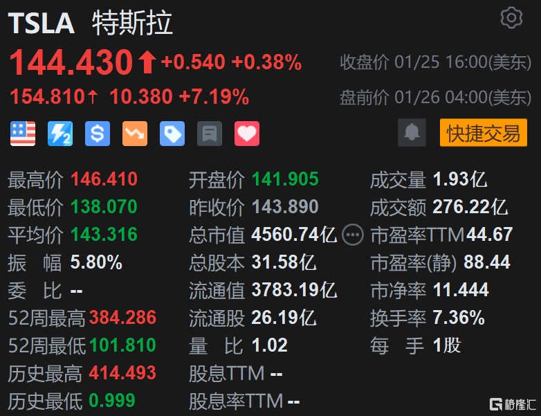 格隆汇1月26日丨特斯拉(TSLA.US)盘前涨超7%,报154.81美元。特斯拉第四季度营收243.18亿美元,超预期的241.1亿美元;调整后EBITDA利润率22.2%,略低于预期的22.3%;调整后每股盈余1.19美元,超预期的1.13美元;净利润率则维持在了15%。